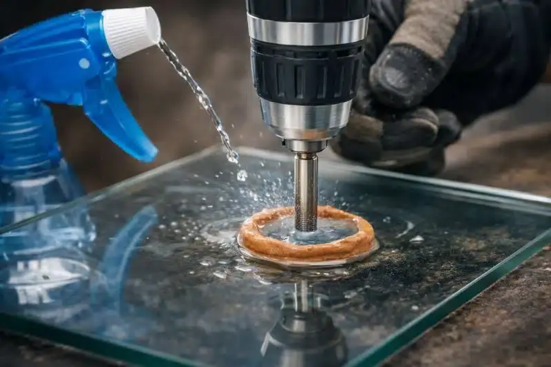 A refrigeração constante é mandatório. Água corrente ou óleo de corte mineral reduzem o atrito e dissipam o calor, preservando o fio da broca e a integridade do vidro. Use um borrifador ou conta-gotas; o fluxo deve ser contínuo, mas suave.