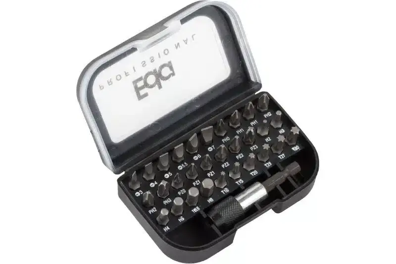 Bits de cromo vanádio oferecem resistência e durabilidade, ideais para profissionais e hobbyistas. Este conjunto de 31 peças inclui pontas fenda, Phillips, Pozi, Allen e Torx, além de um engate rápido compatível com furadeiras e parafusadeiras.