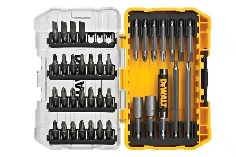 O Jogo 37 Peças da DEWALT oferece um kit completo para parafusamento, com bits de aço com tratamento térmico, dois soquetes e um extensor magnético compatíveis com diversas parafusadeiras.