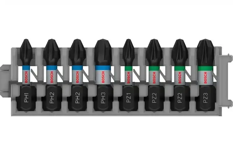 Bits fabricados em liga de aço S2 modificada, com tratamento térmico otimizado para maior resistência e durabilidade. Design com zona de torção alongada que absorve o torque e reduz o desgaste durante o uso contínuo. Compatível com parafusos Phillips (PH), Pozidriv (PZ) e Torx (T), oferecendo versatilidade em diferentes aplicações.