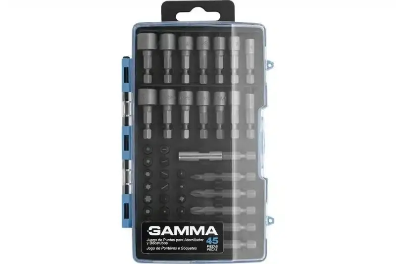 O Jogo de Ponteiras e Soquetes da GAMMA, com 45 peças (14 soquetes, 30 ponteiras e 1 adaptador magnético), é versátil e completo para profissionais e uso doméstico.