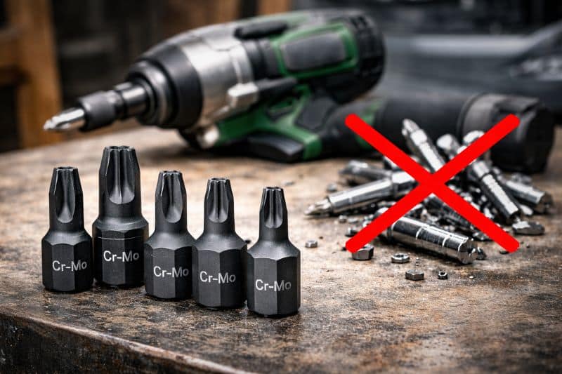Nem pense em usar qualquer ponteira! Para parafusadeira de impacto, só as de aço cromo molibdênio. Elas aguentam o tranco dos “martelinhos” internos, sem quebrar ou estourar. As ponteiras comuns, de aço rápido, não foram feitas para isso.
