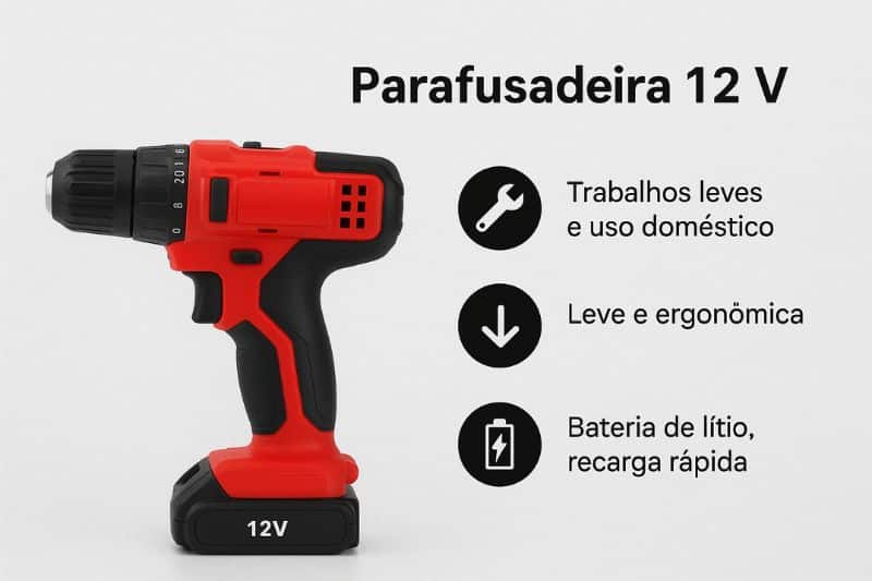 Uma parafusadeira de 12V atende tarefas leves e domésticas, mas pode faltar torque e resistência para uso profissional contínuo ou com materiais densos.